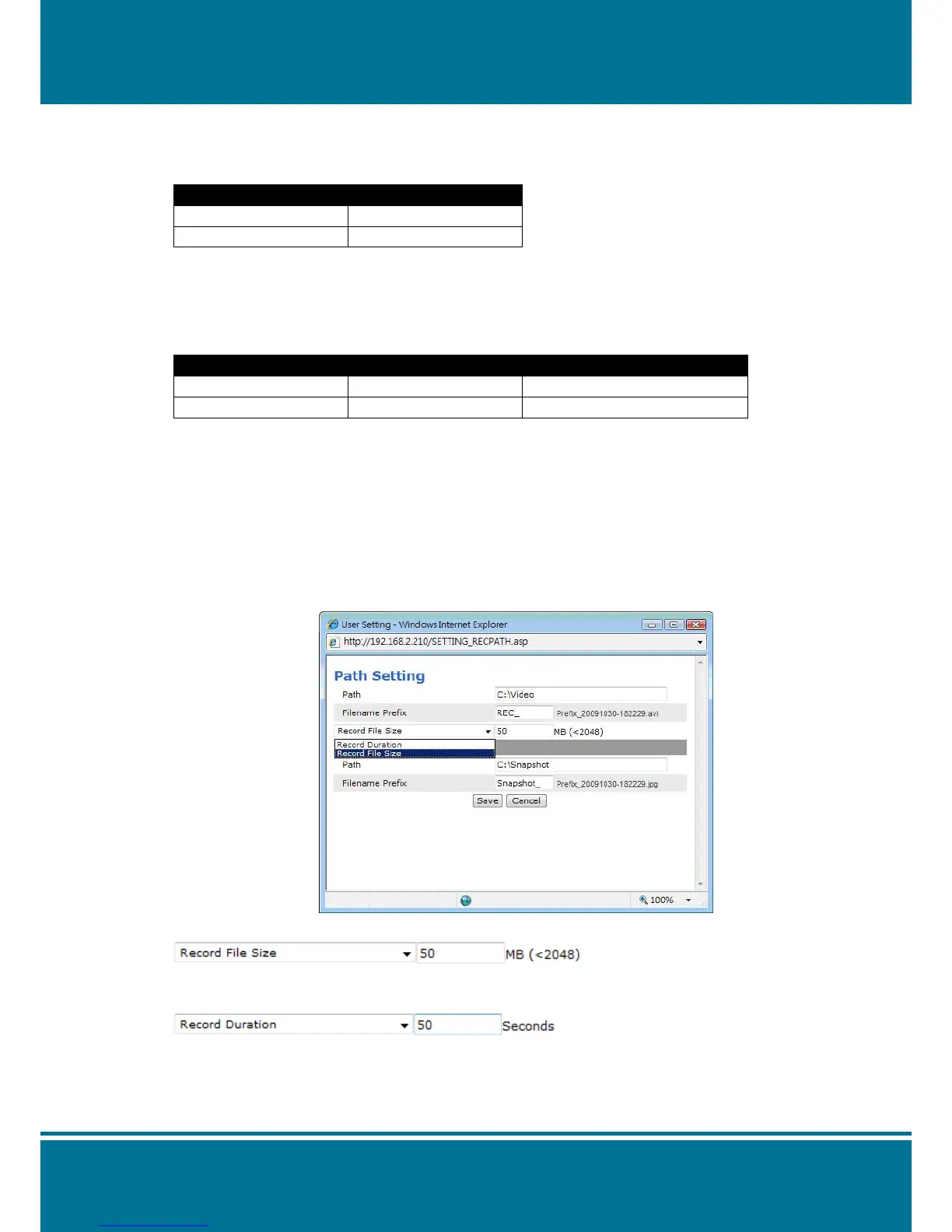 The Record Path Setting supported only and it has limit of file size.