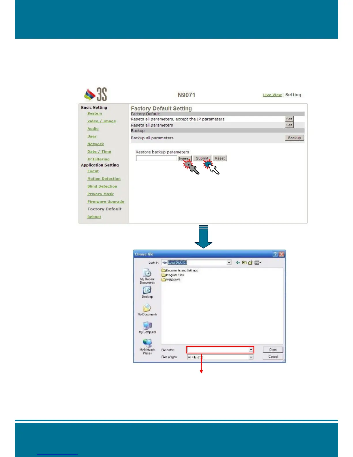 Click Browse to select a backup file and click Submit to confirm it.