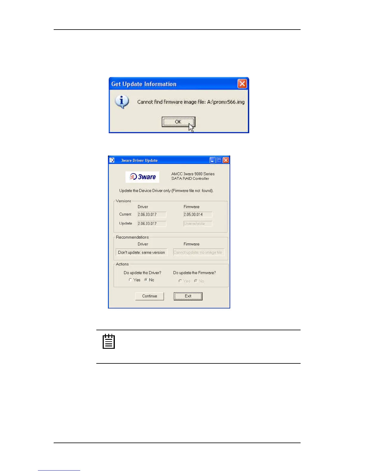 error message, and the 3ware Driver/Firmware Update dialog box will