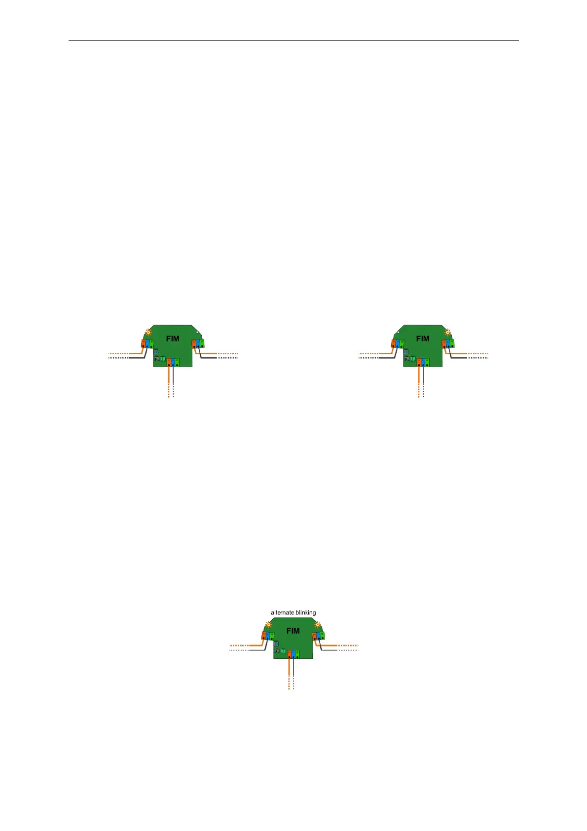 If T-Branch is shorted, both A and B indicators will blink fast orange alternately. Both relays of the FIM are open,