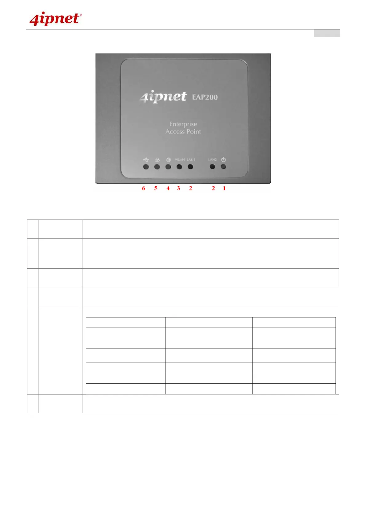 LAN LED LED ON indicates LAN cable connected; OFF indicates no connection; BLINKING