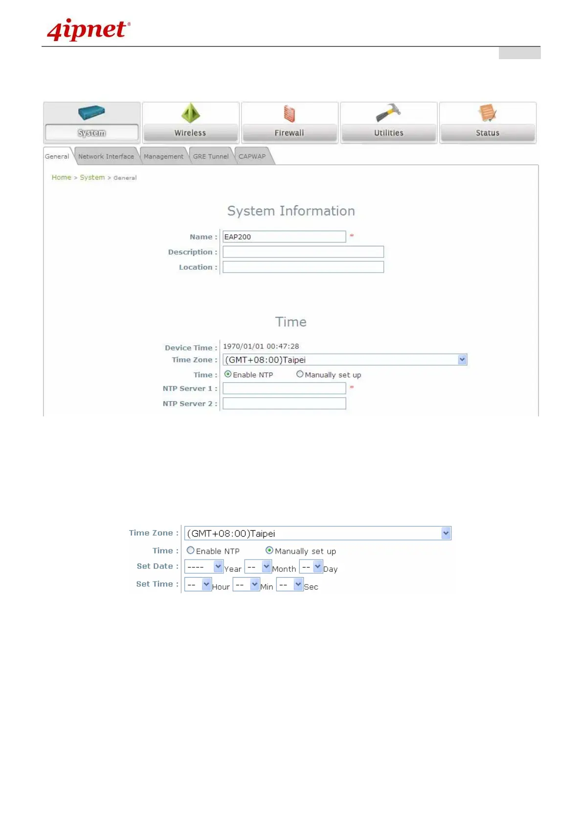 entries to the Name, Description, and Location fields as well as set the device’s time.