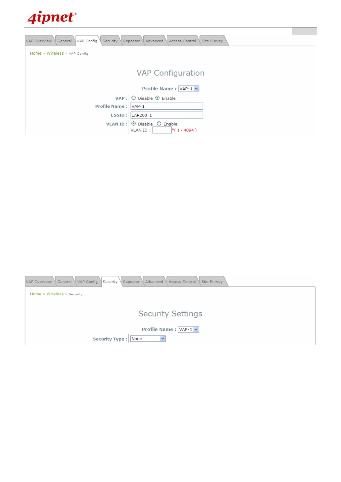 The following instructions will guide the user to set up wireless security with a specific VAP. If only
