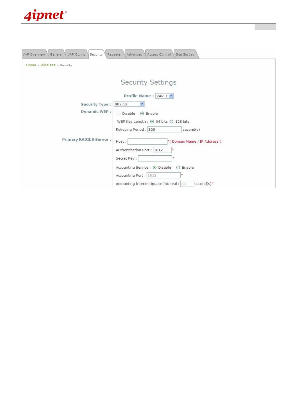Rekeying Period: The time interval for the dynamic WEP key to be updated; the time unit is in