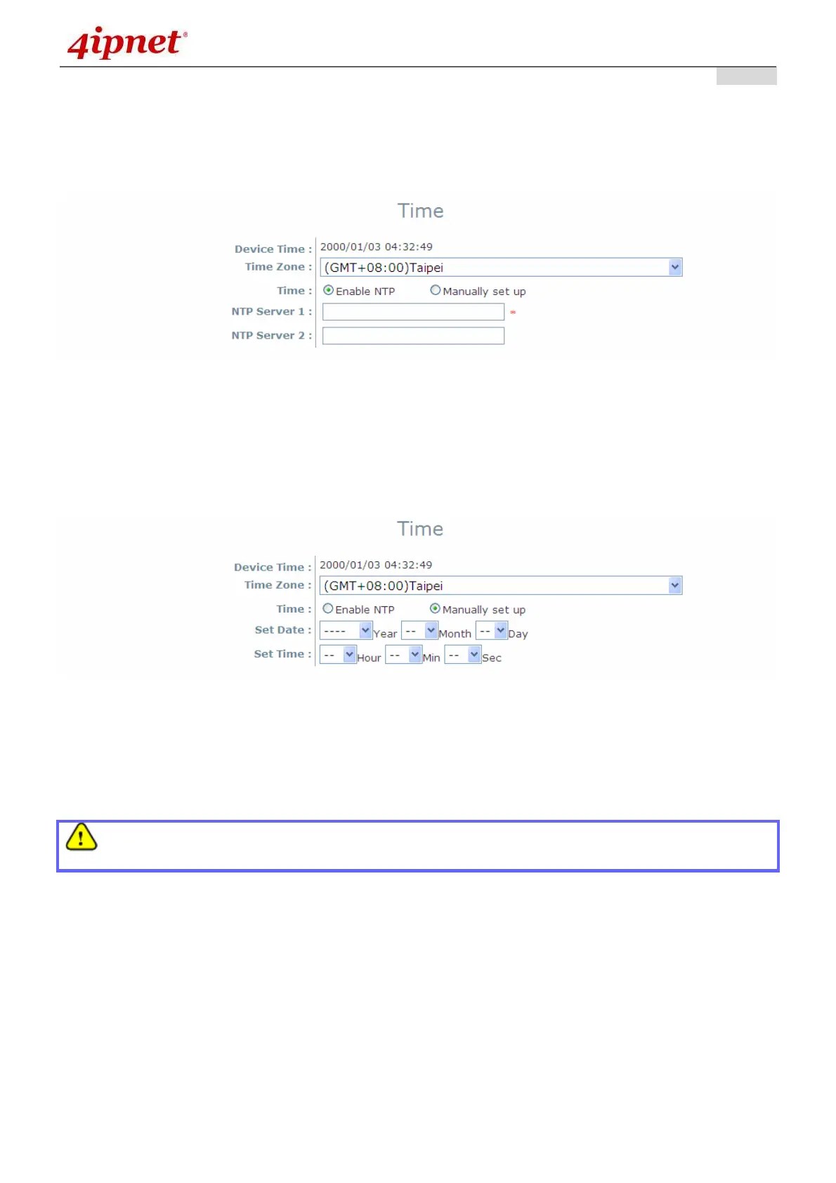 By selecting Manually set up, the administrator can manually set the system date and time.