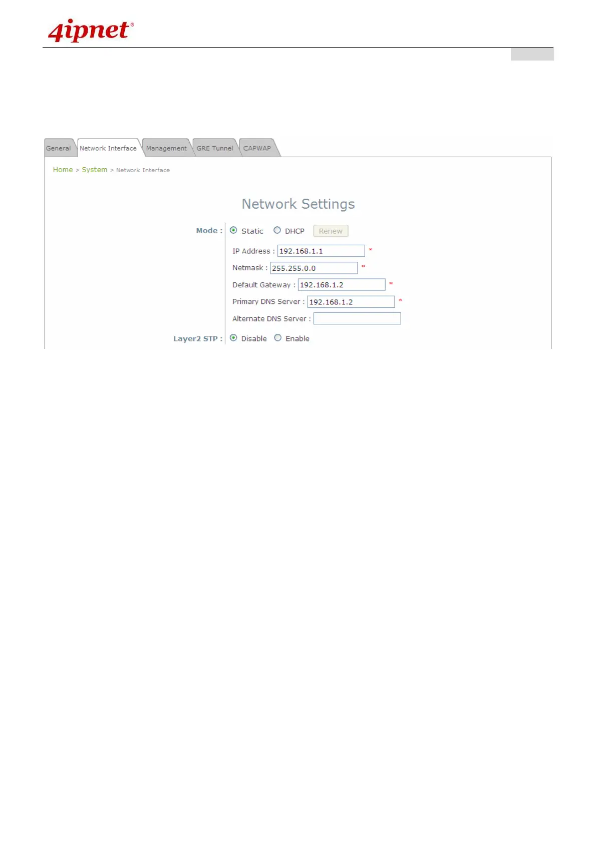 On this page, the network settings of the device can be configured; fields with a red asterisk (i.e. IP