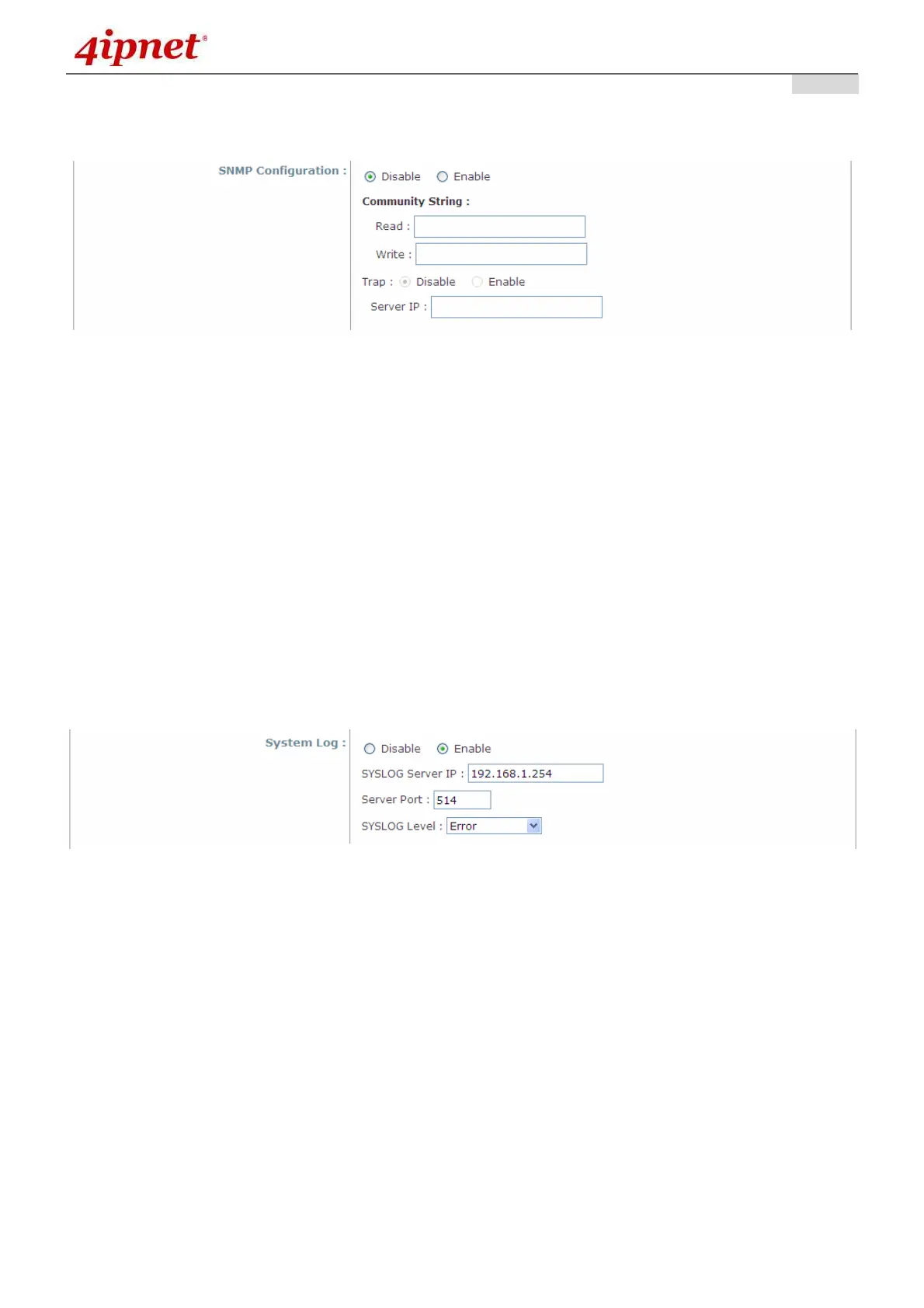 • System Log: By enabling this function, specify an external SYSLOG server to accept SYSLOG