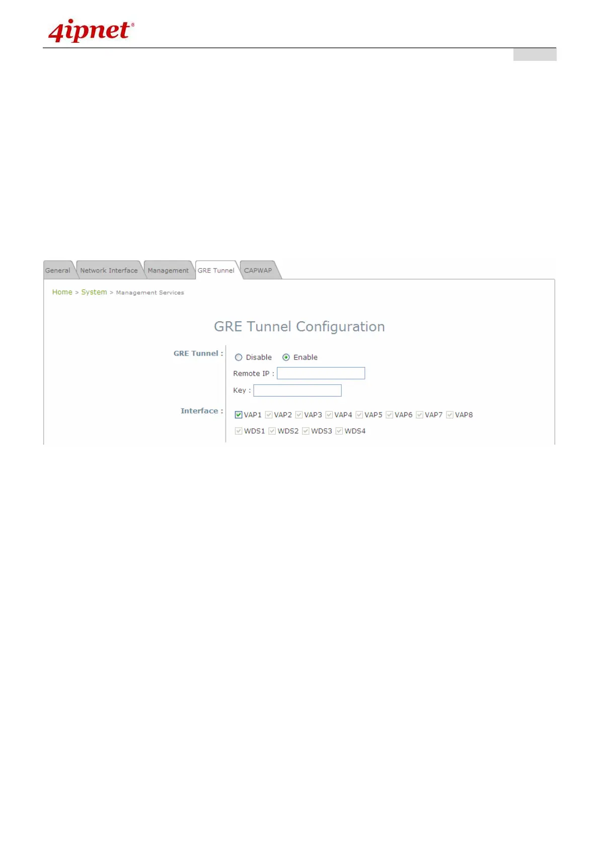 • Interface: Select a VAP or WDS that its traffic will pass through the GRE Tunnel between APs and