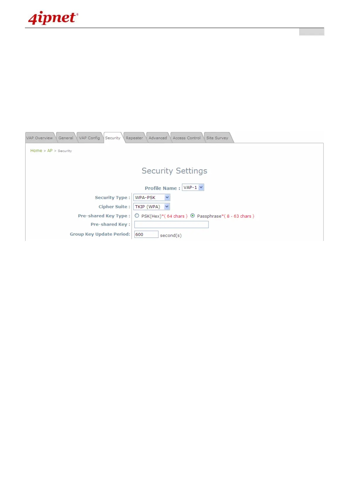 Group Key Update Period: The time interval for the Group Key to be renewed; the time unit is in