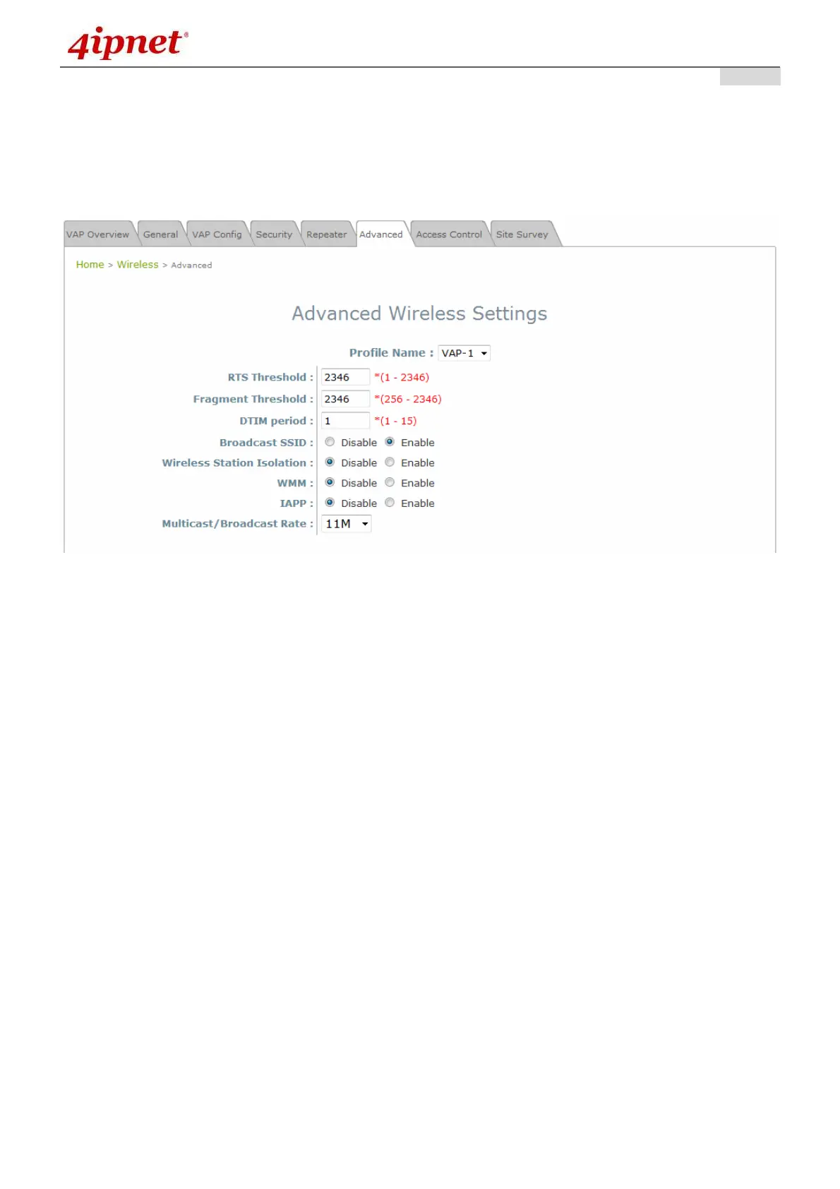 Advanced Wireless Settings Page
