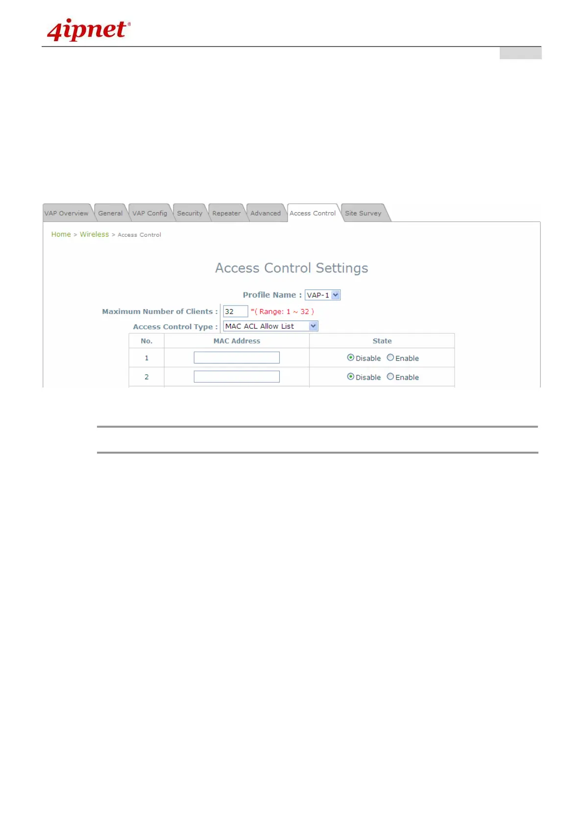 Disable Access Control: When Disable is selected, there is no restriction for client devices to