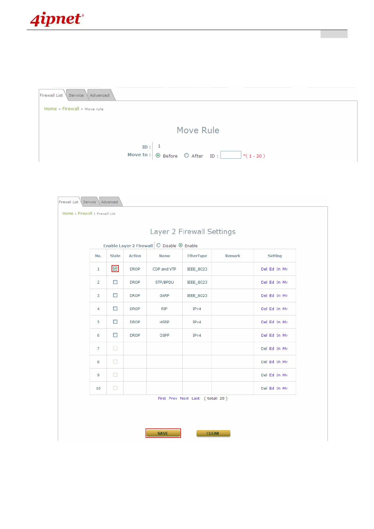 Mv in Setting column of firewall list will lead to the following page for reordering confirmation. After SAVE