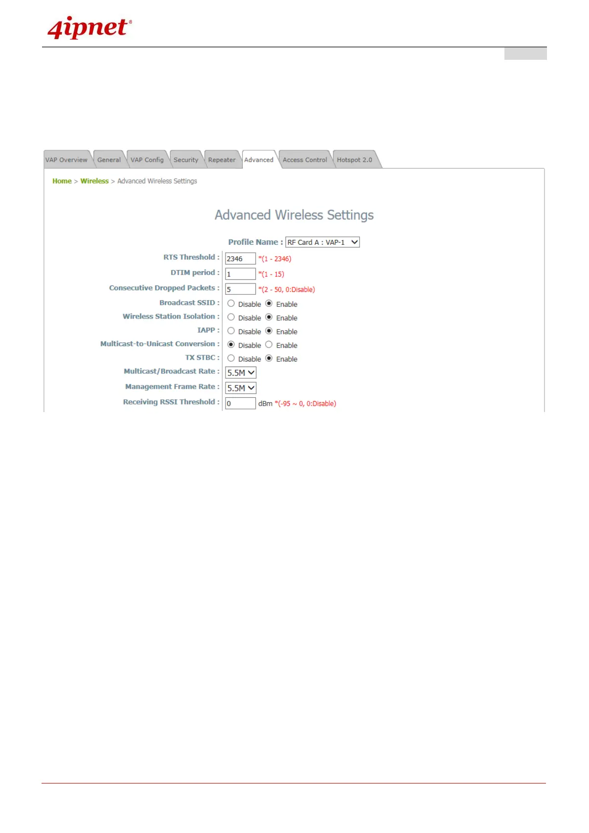 The advanced wireless settings for the Access Point’s VAP (Virtual Access Point) profiles allow