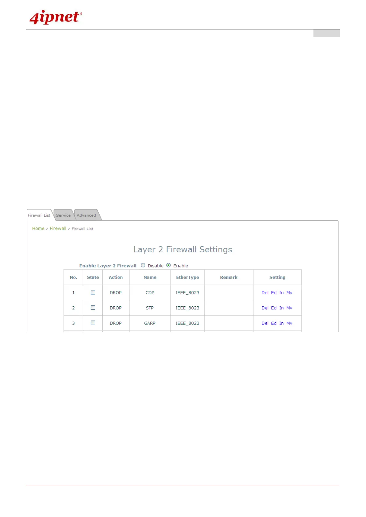 Setting: 4 actions are available; Del denotes to delete the rule, Ed denotes to edit the rule, In