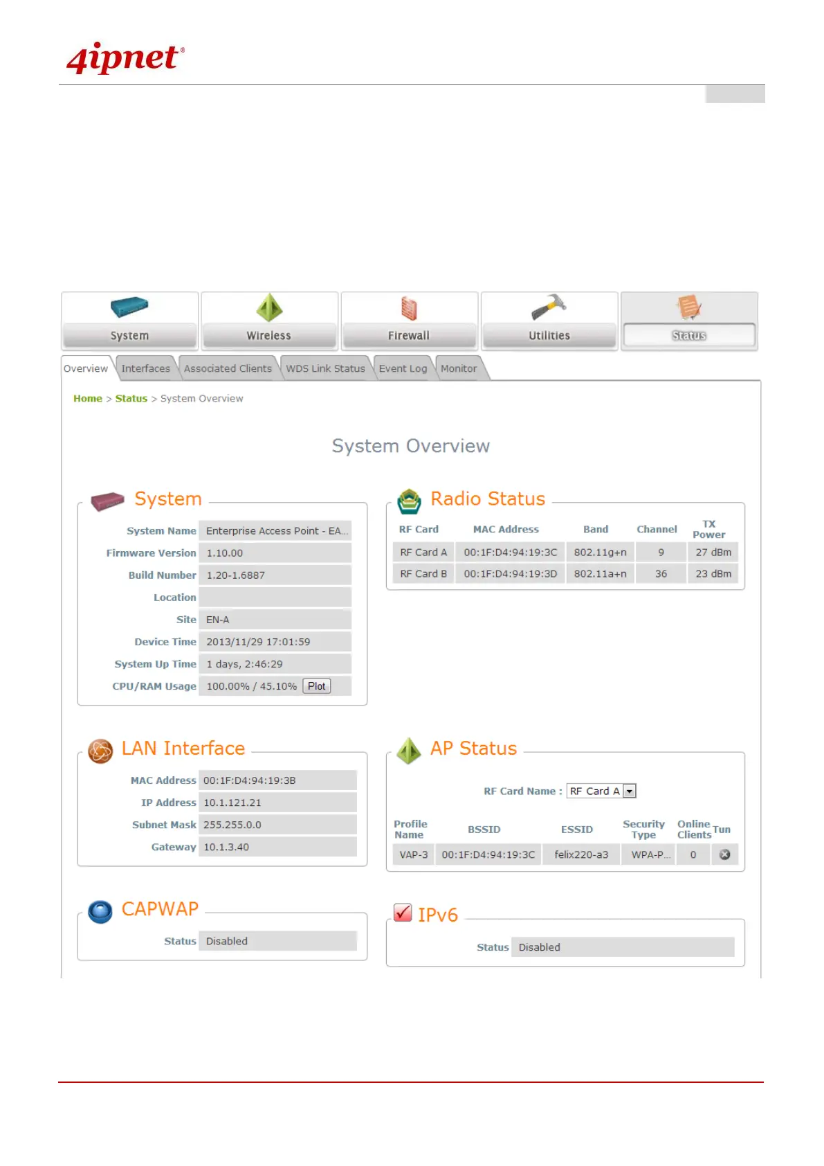 functions: Overview, Interfaces, Associated Clients, WDS Link Status, Event Log and Monitor.