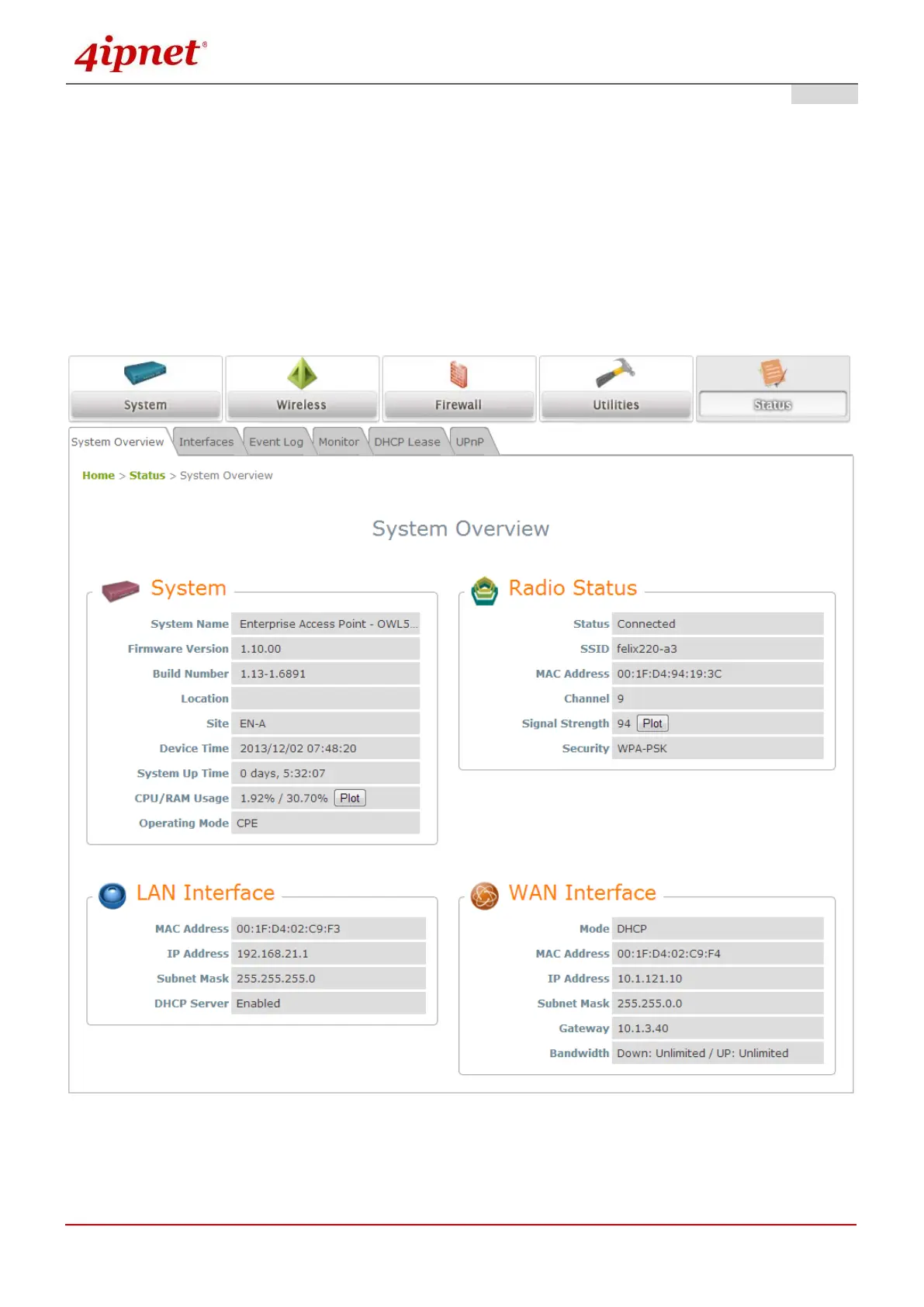 This section displays the status of System Overview, Interfaces, Event Log, Monitor, DHCP Lease and UPnP.