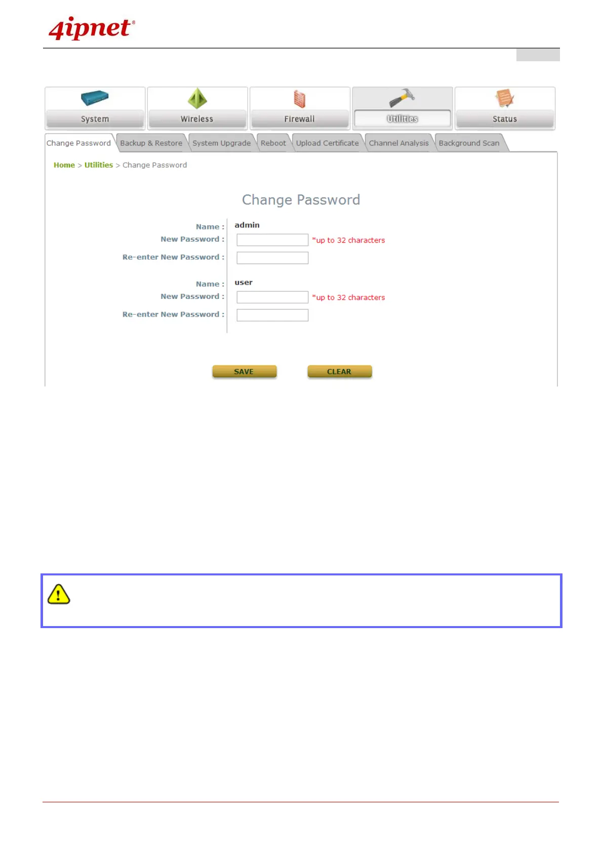 Enter the old password and then a new password with a length of up to 32 characters, and retype it in