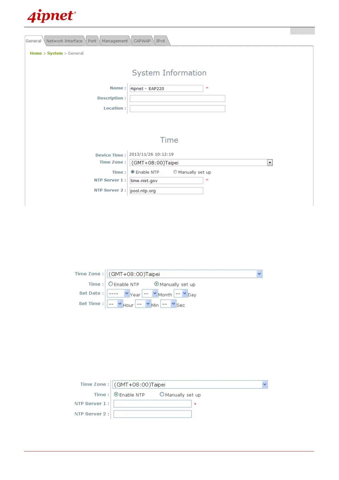 The alternative method is NTP. Upon selecting NTP under the Time field, the configuration changes
