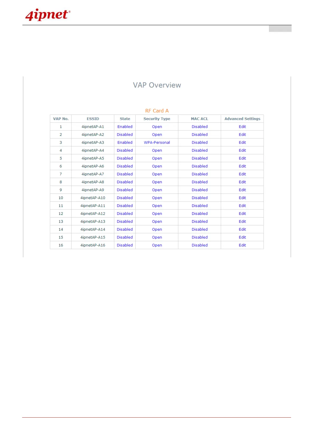 To set up the AP’s wireless access, refer to the following VAP-1 configuration (other VAP