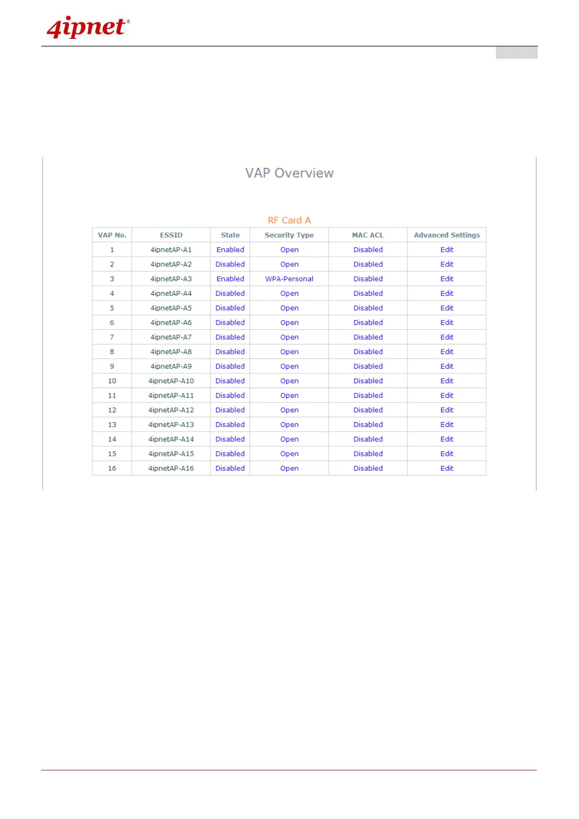 To proceed with specific VAP configuration, click on the corresponding cell in the State column and