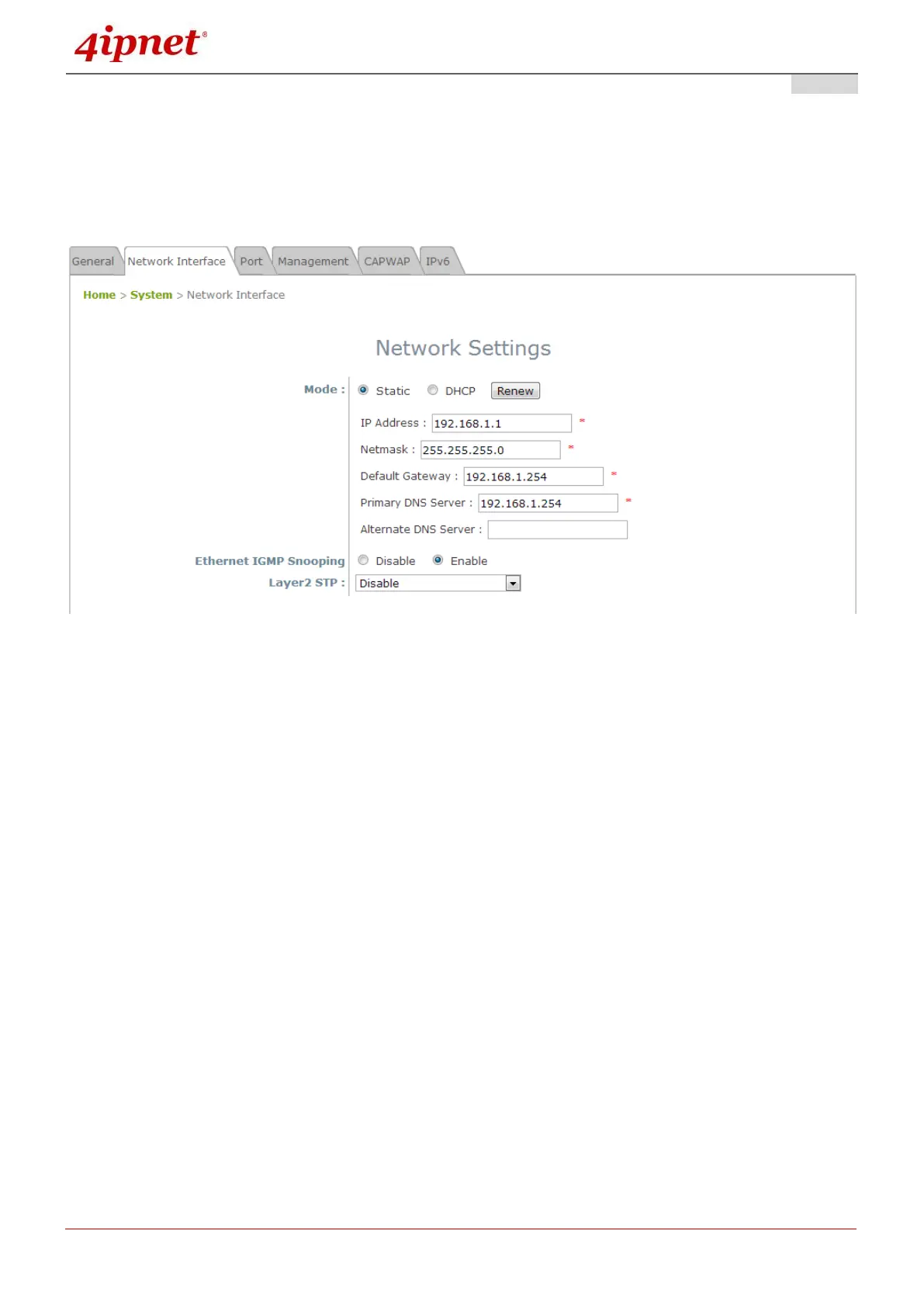 On this page, the network settings of the device can be configured; fields with a red asterisk (i.e. IP