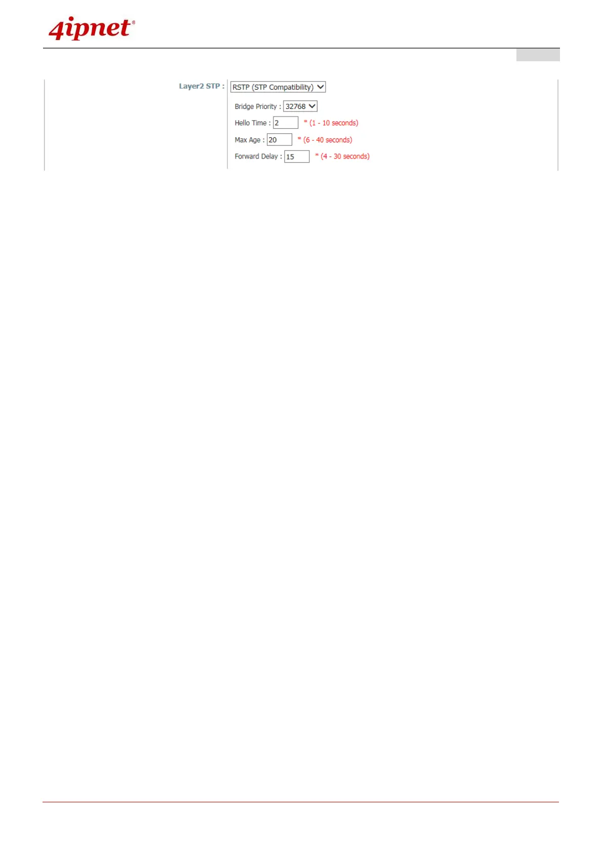 Priority, Hello Time, Max Age, and Forward Delay. Please refer to IEEE standards for recommended
