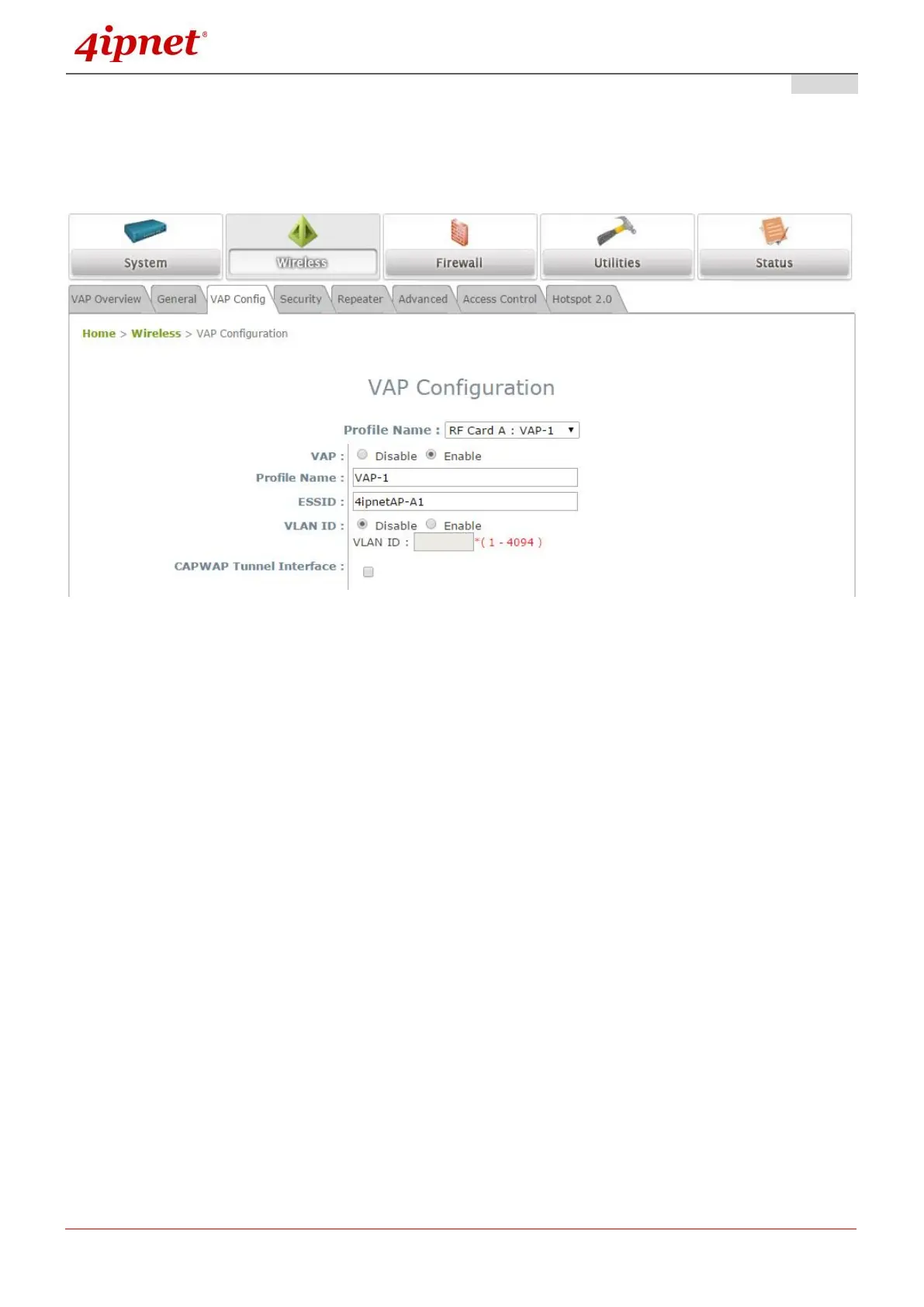 VLAN ID: The 4ipnet Access Point supports tagged VLANs (virtual LANs). To enable VLAN function,