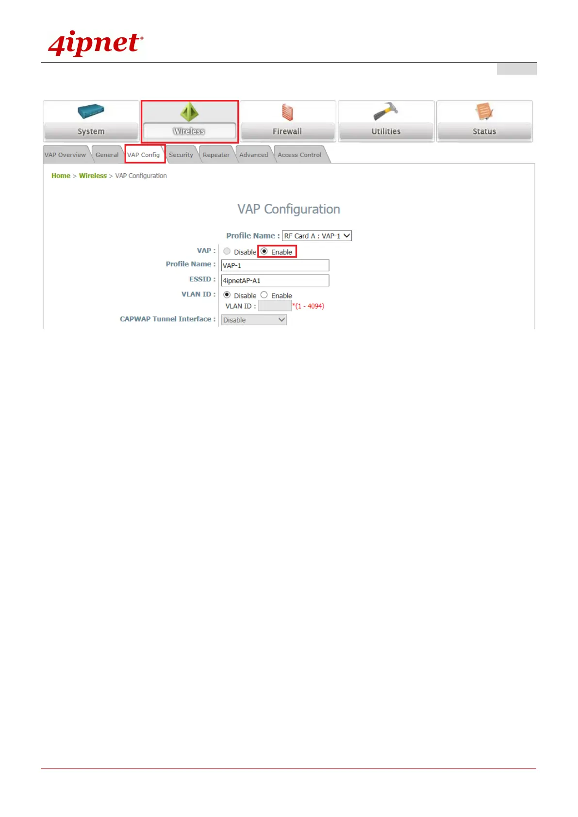 (b) Enable a selected VAP from the drop-down menu of Profile Name and configure related