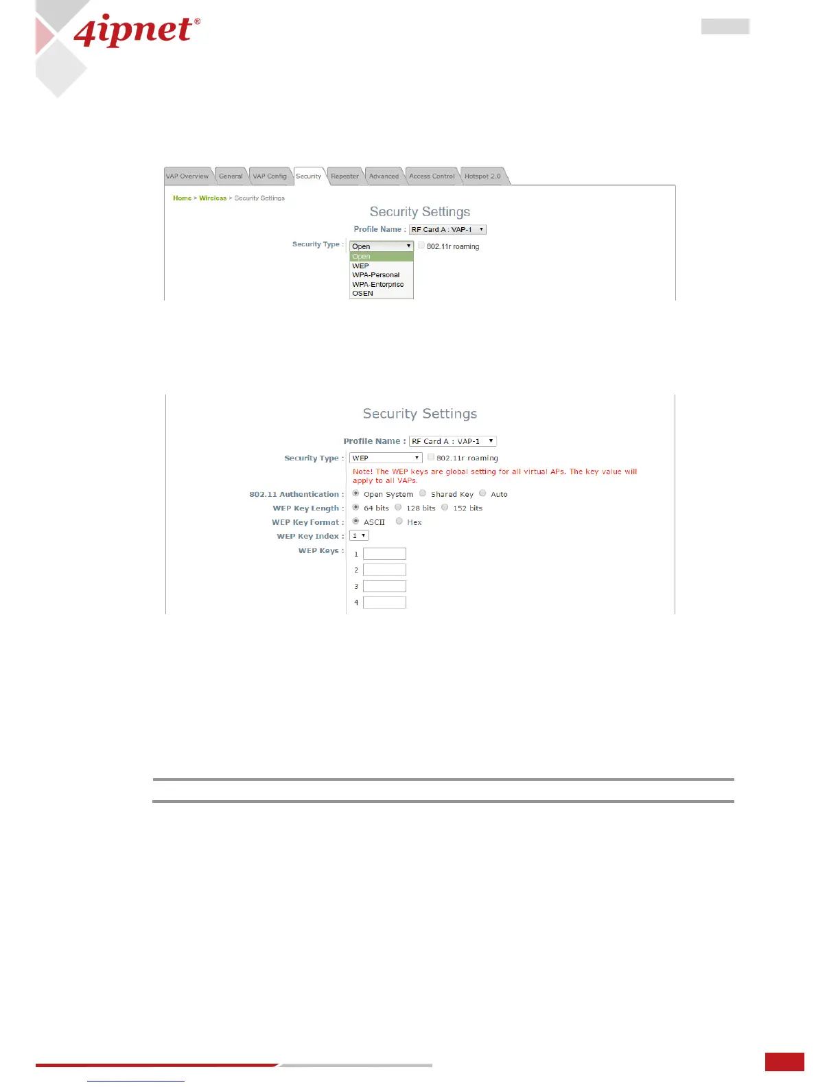 - WEP Keys: Provide the pre-defined WEP key value; the system supports up to 4 sets of WEP keys.