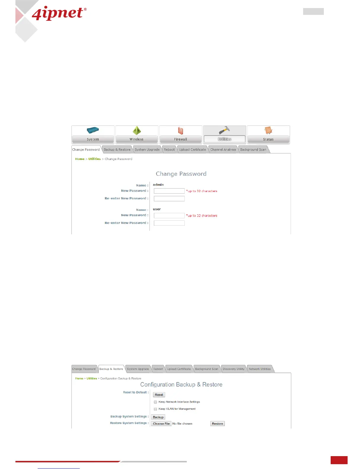 The administrator can change password on this page. Enter the original password (“admin”) and new