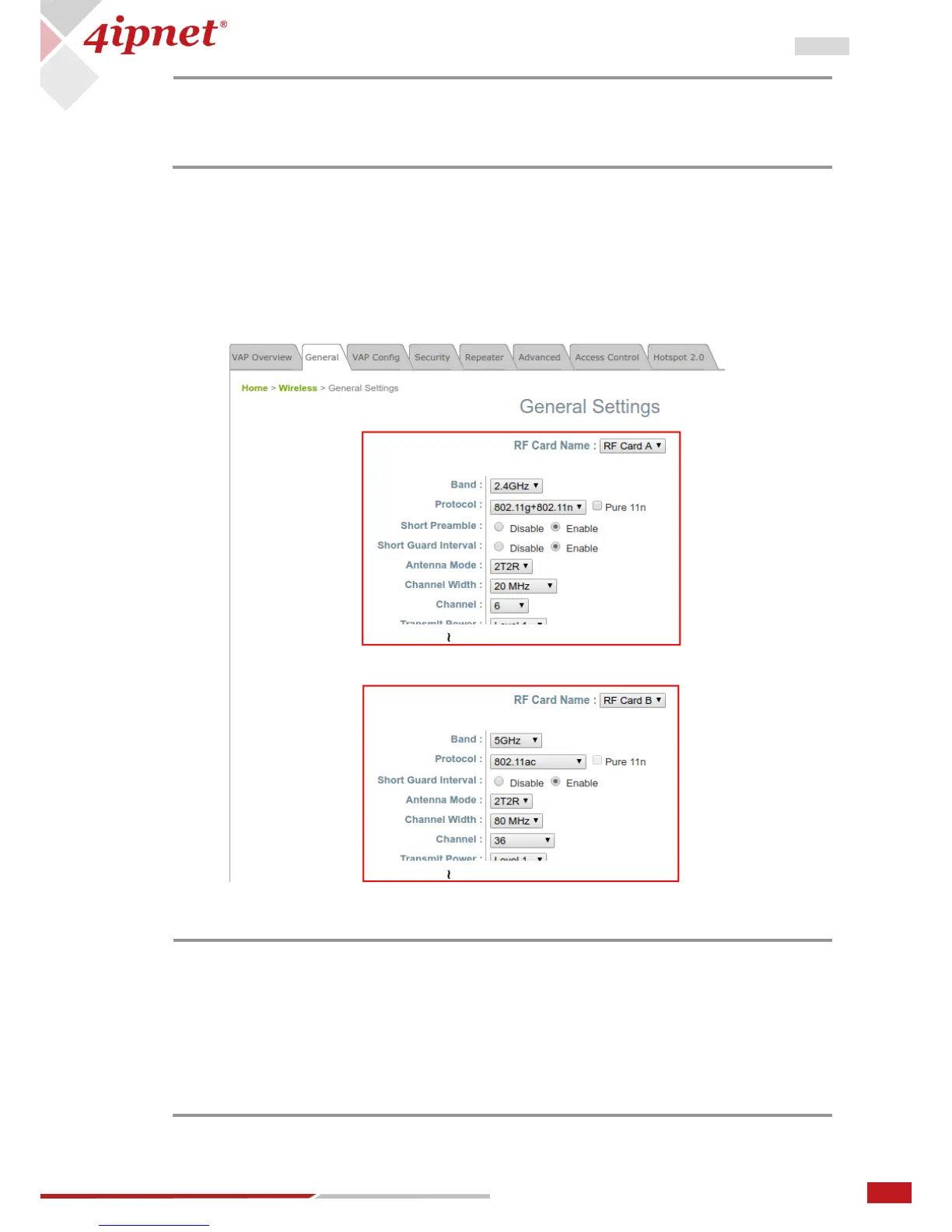 2.4 GHz band and RF Card B is operating in 5 GHz band, both of which are enabled by default.