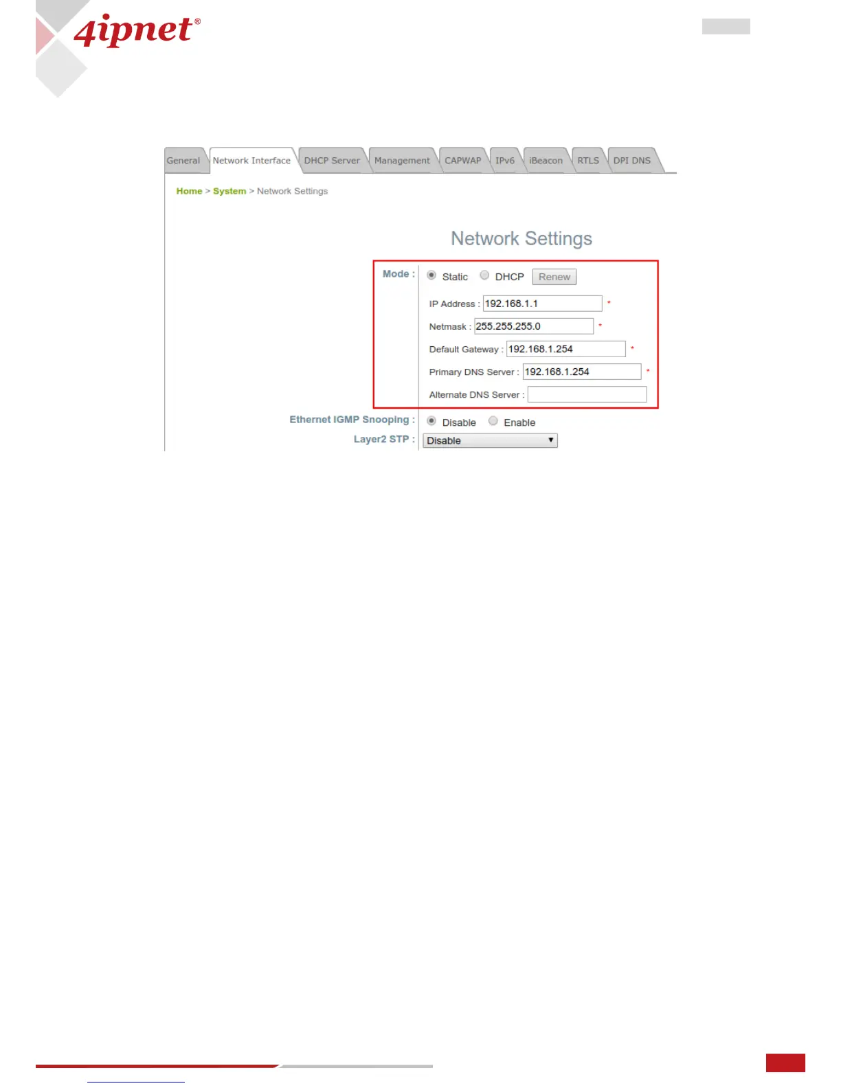 Mode – Static: The administrator can manually set up the static LAN IP address. All required fields are