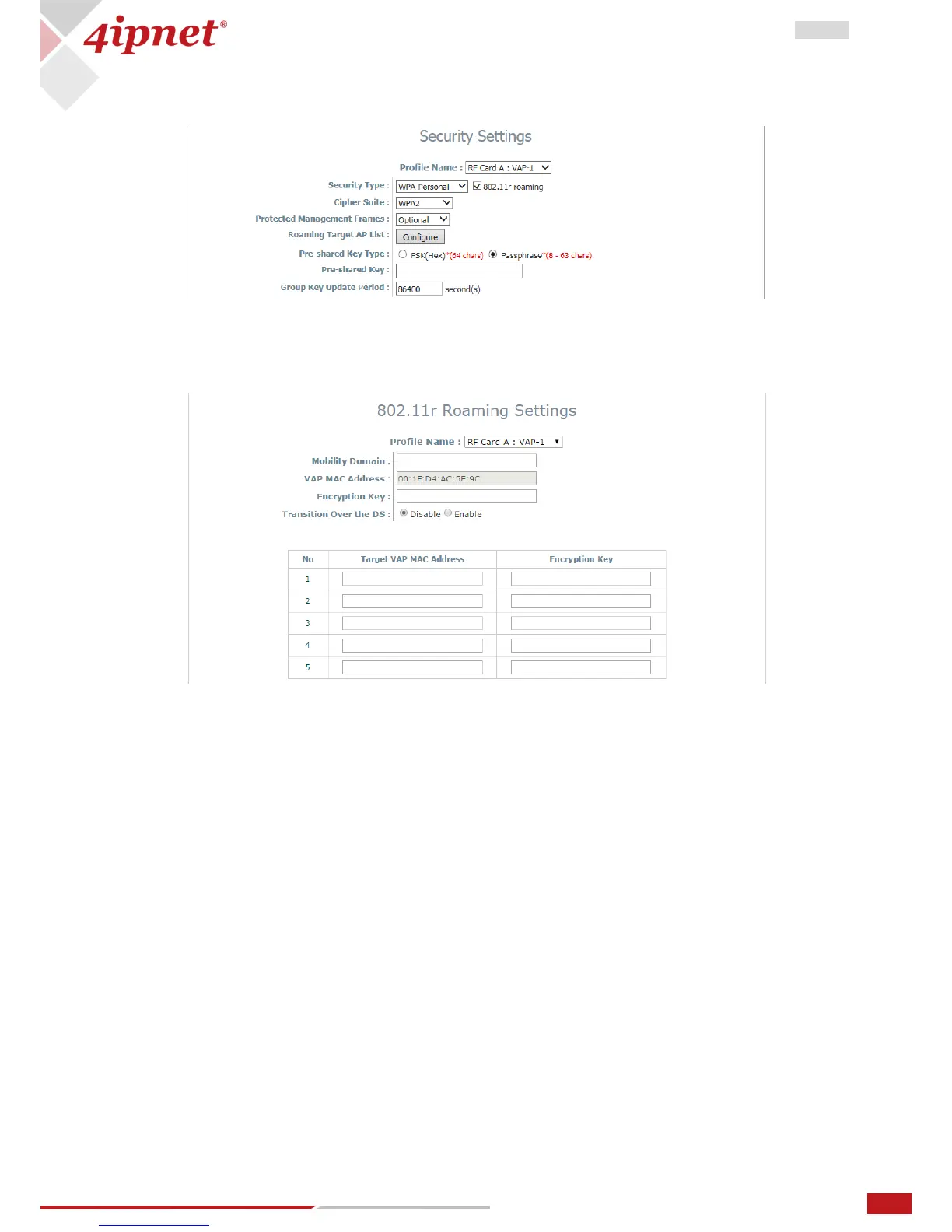 - 802.11r Roaming: Roaming is possible for clients within the same Mobility Domain on different