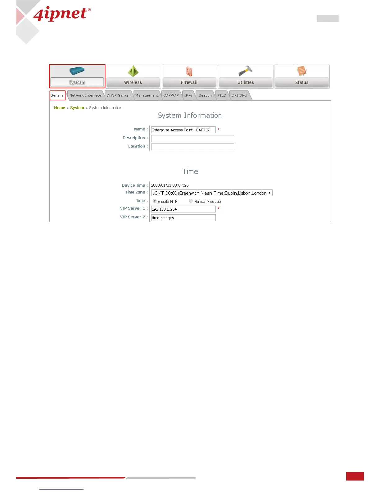 Go to System General page (Home > System > General) to configure general information for the AP.