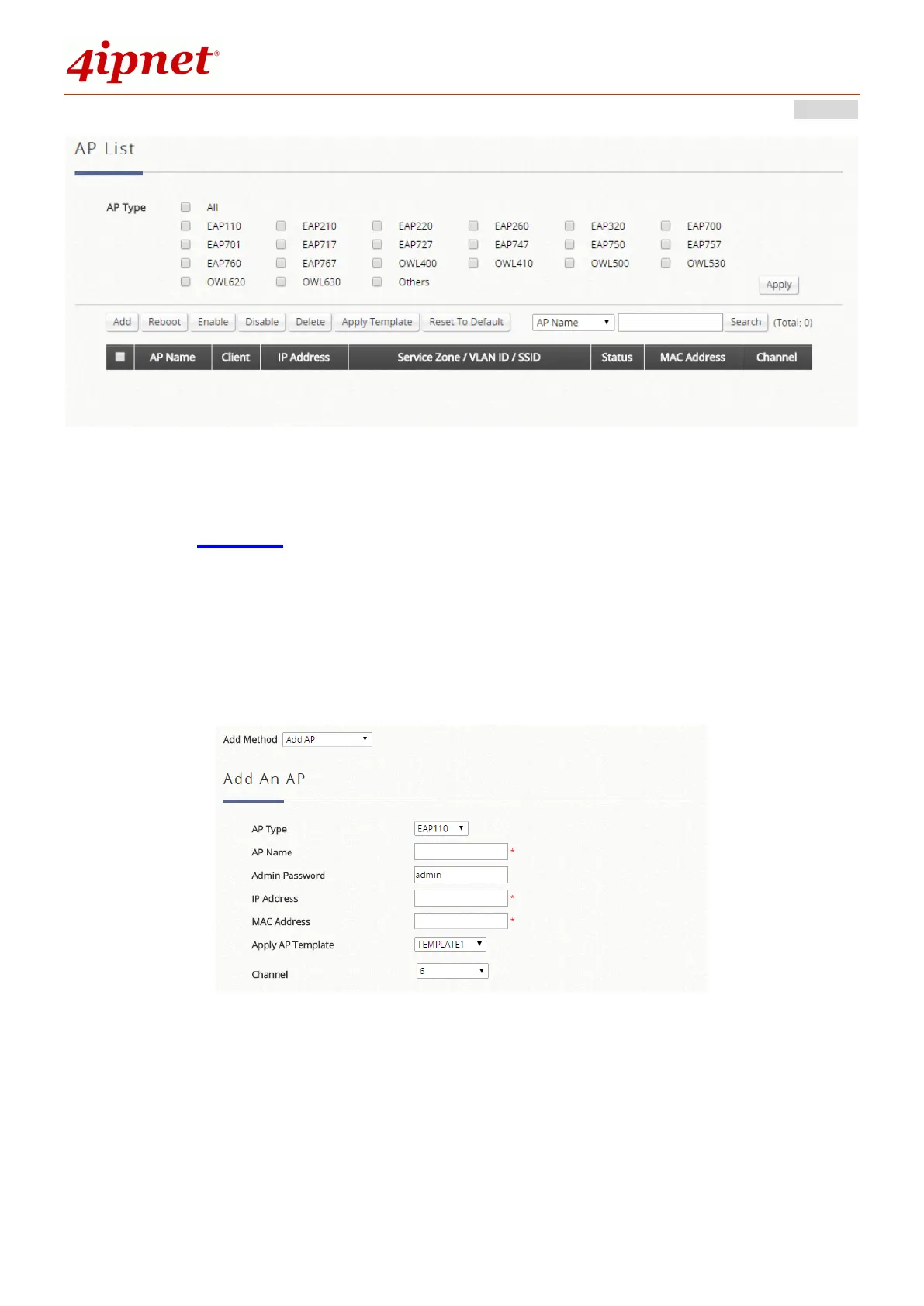The administrator can add supported APs into the List table manually by clicking “Add” and selecting