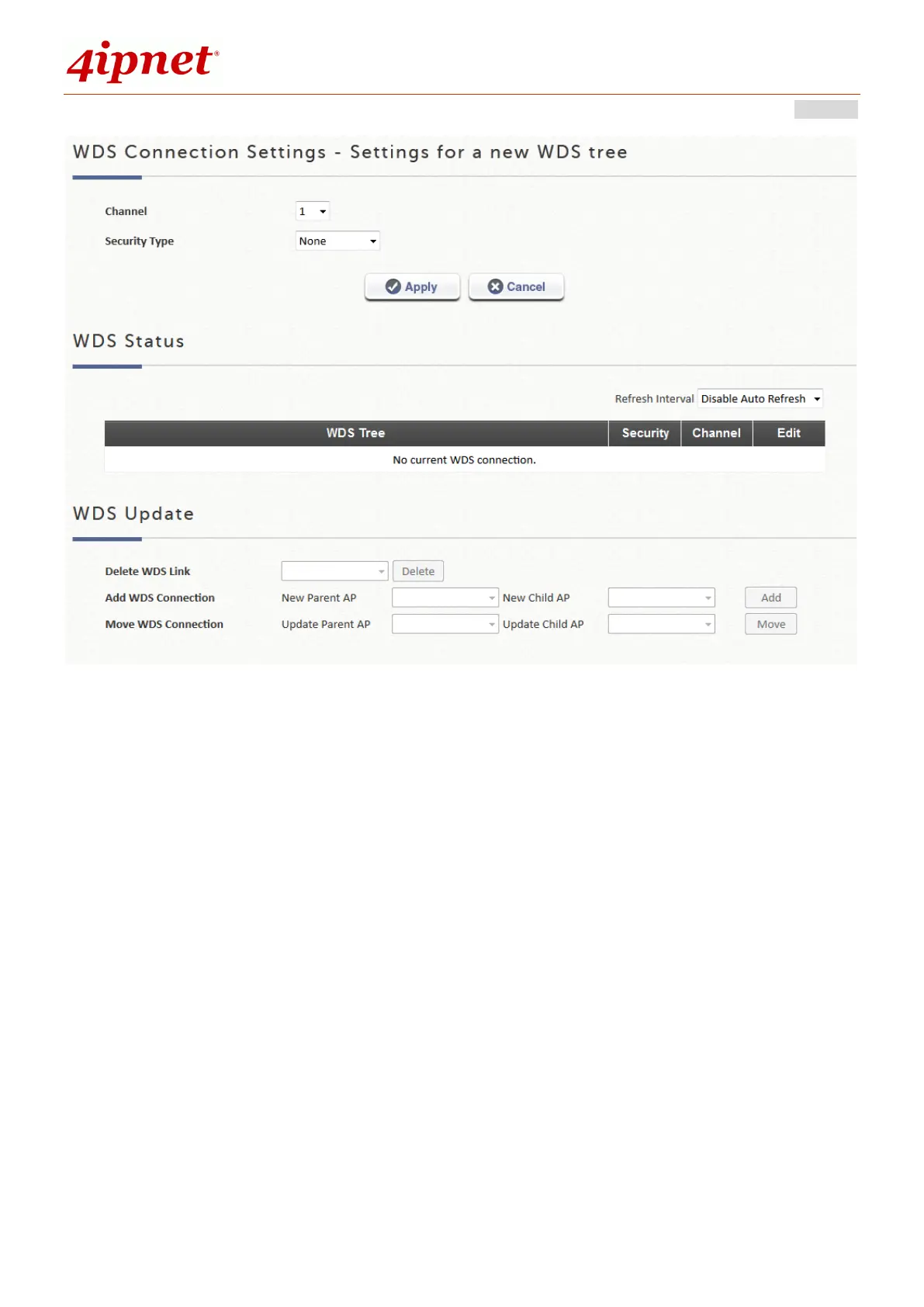 WDS Status: Shows the added APs in the WDS Tree with Security and Channel