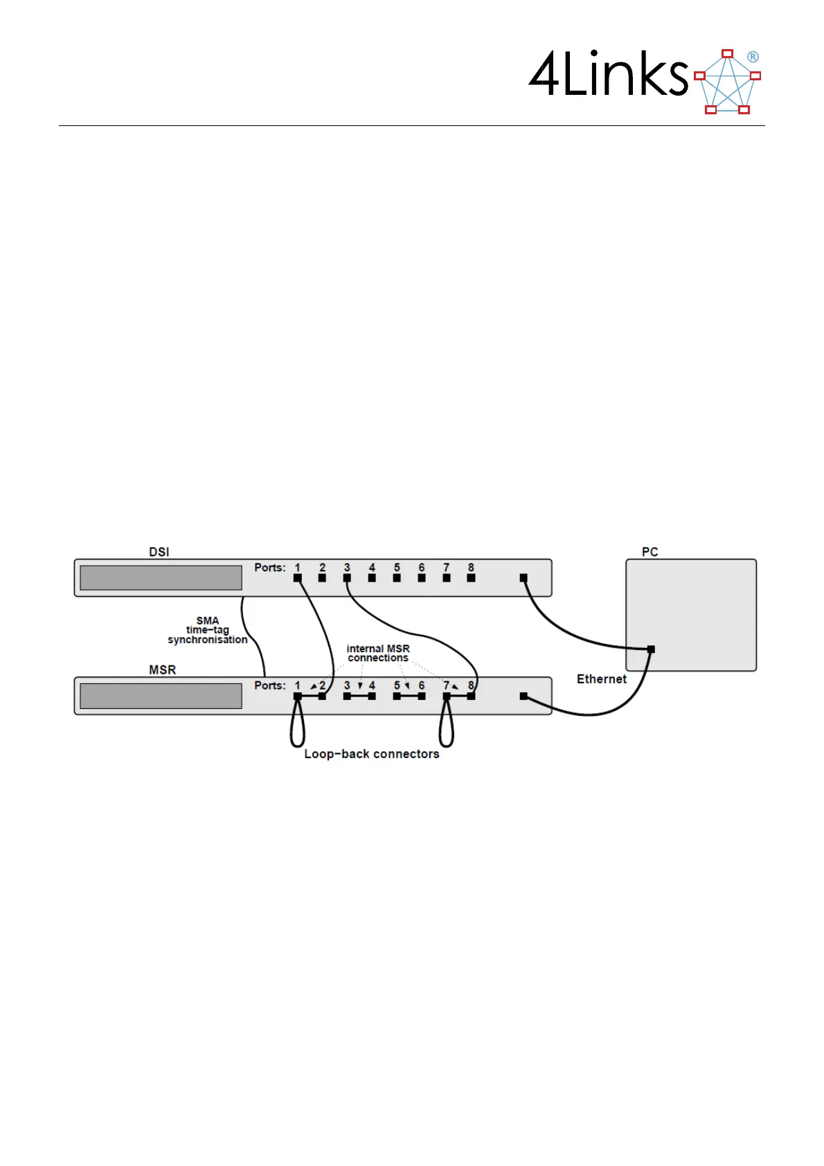 respectively of a 4Links Multi-link SpaceWire Recorder (MSR) unit, using cables approximately 0.5m long.