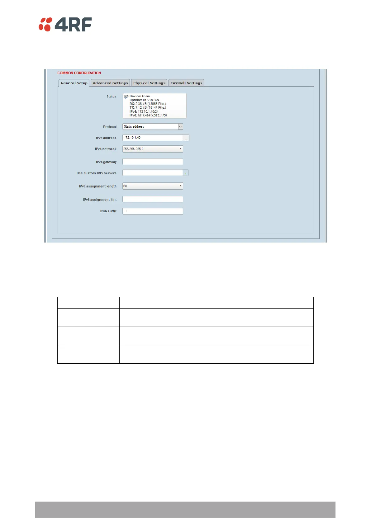 When the Protocol is set to ‘Static Address’ this sets the static IP Address of the radio (Management and