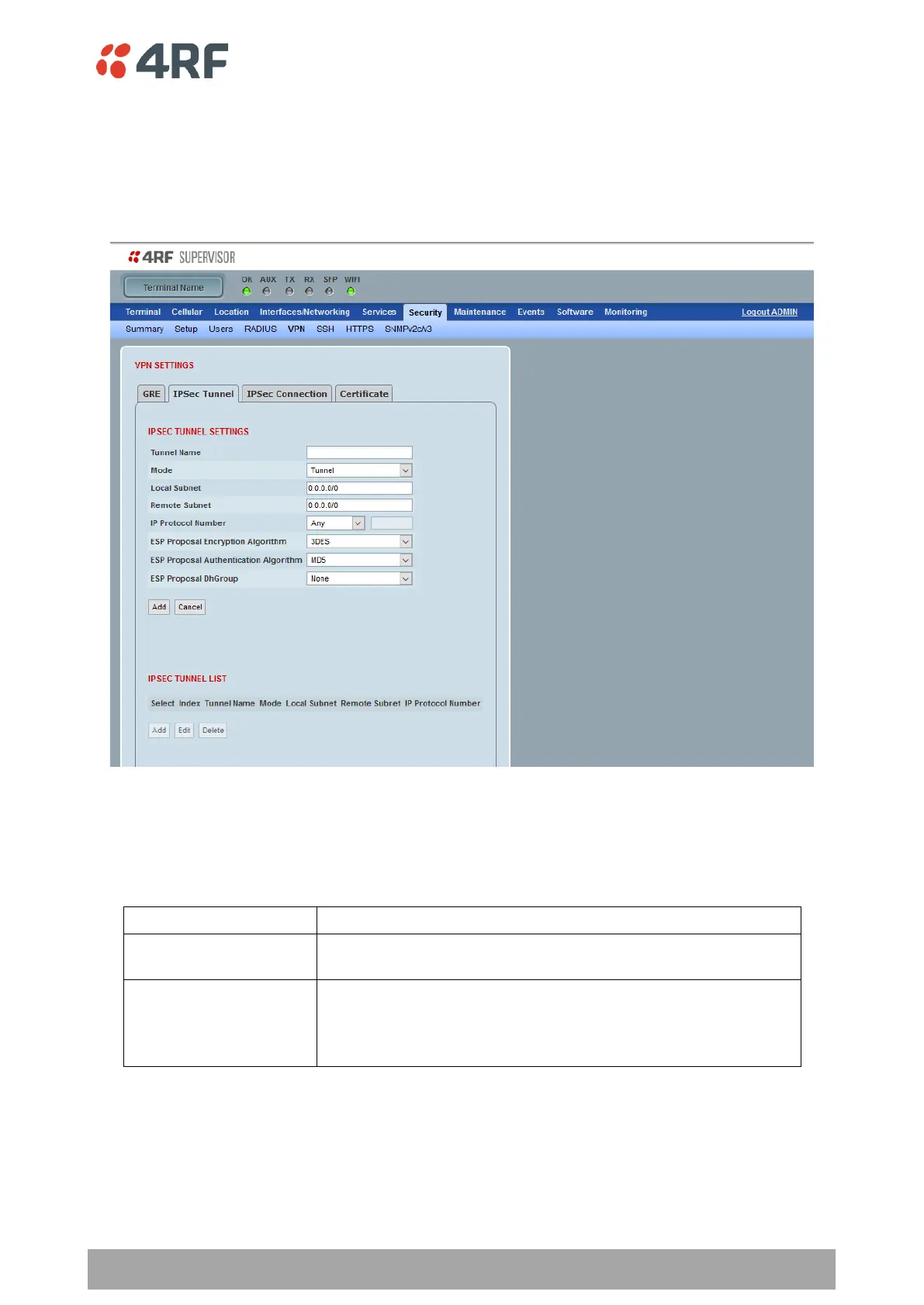 This page provides VPN IPSec Tunnel configuration.