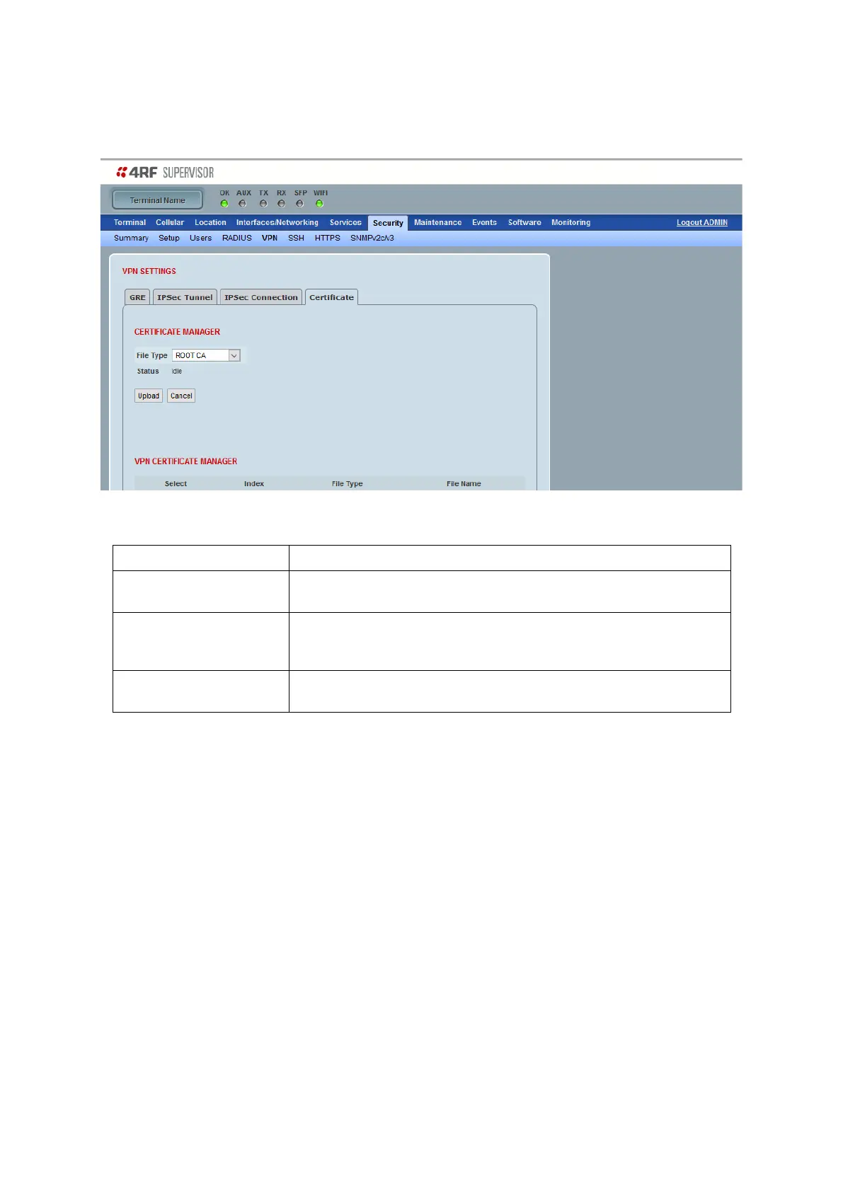 This page provides IPSec Certificate configuration provides the method to upload certificates for IPSec.