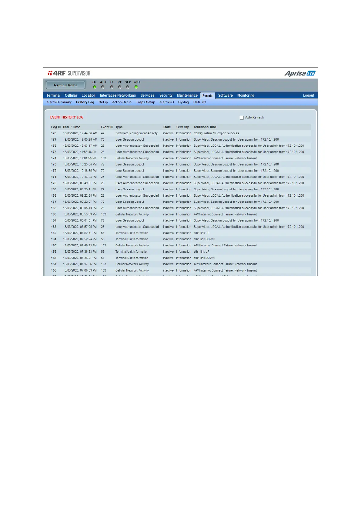 The Event History page selected will refresh automatically every 12 seconds if the Auto Refresh is ticked.