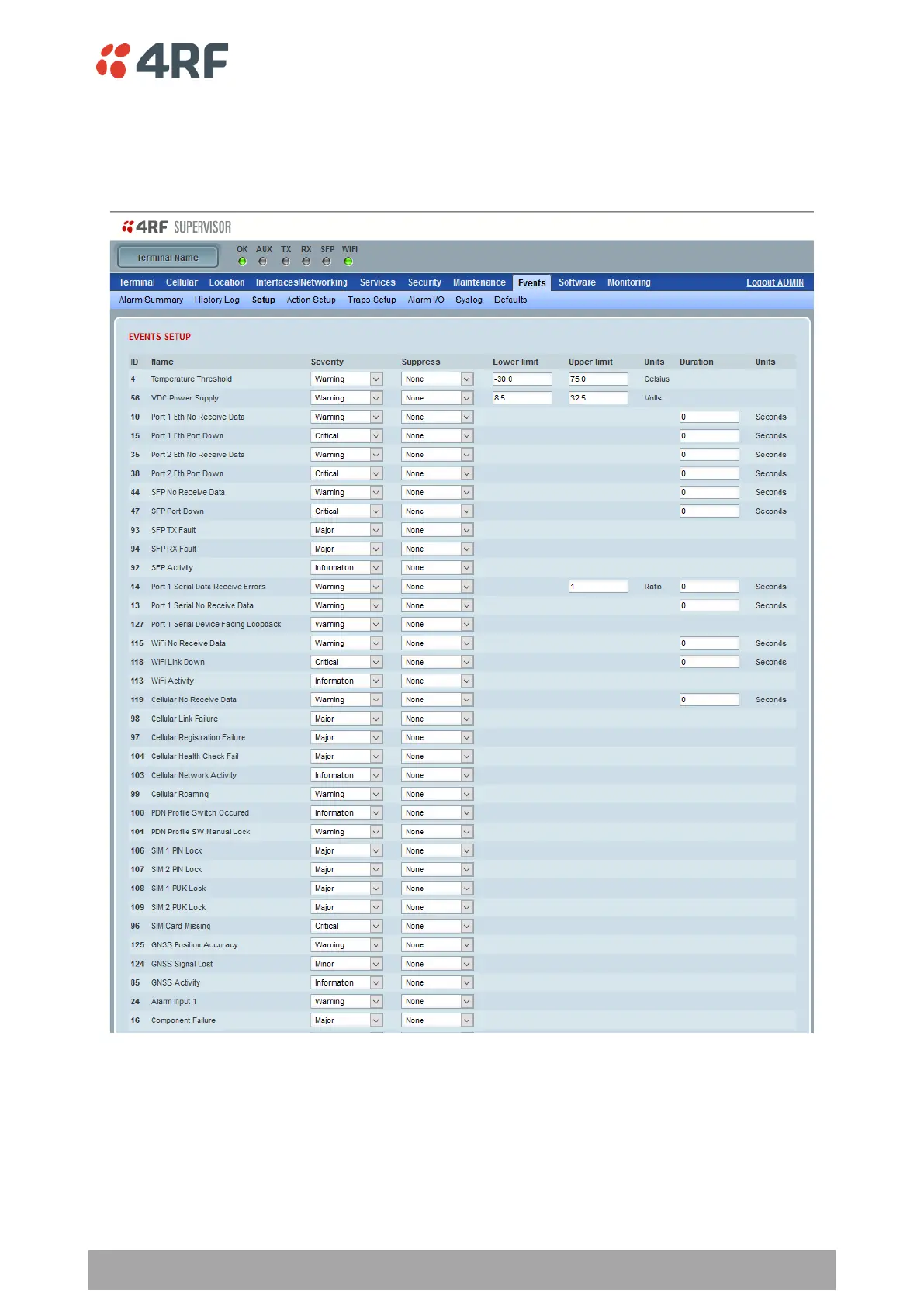 4RF Aprisa LTE - Events > Setup