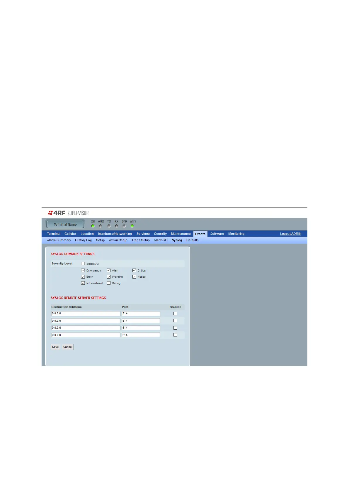 The Security Level selection options provide filtering of Syslog messages.