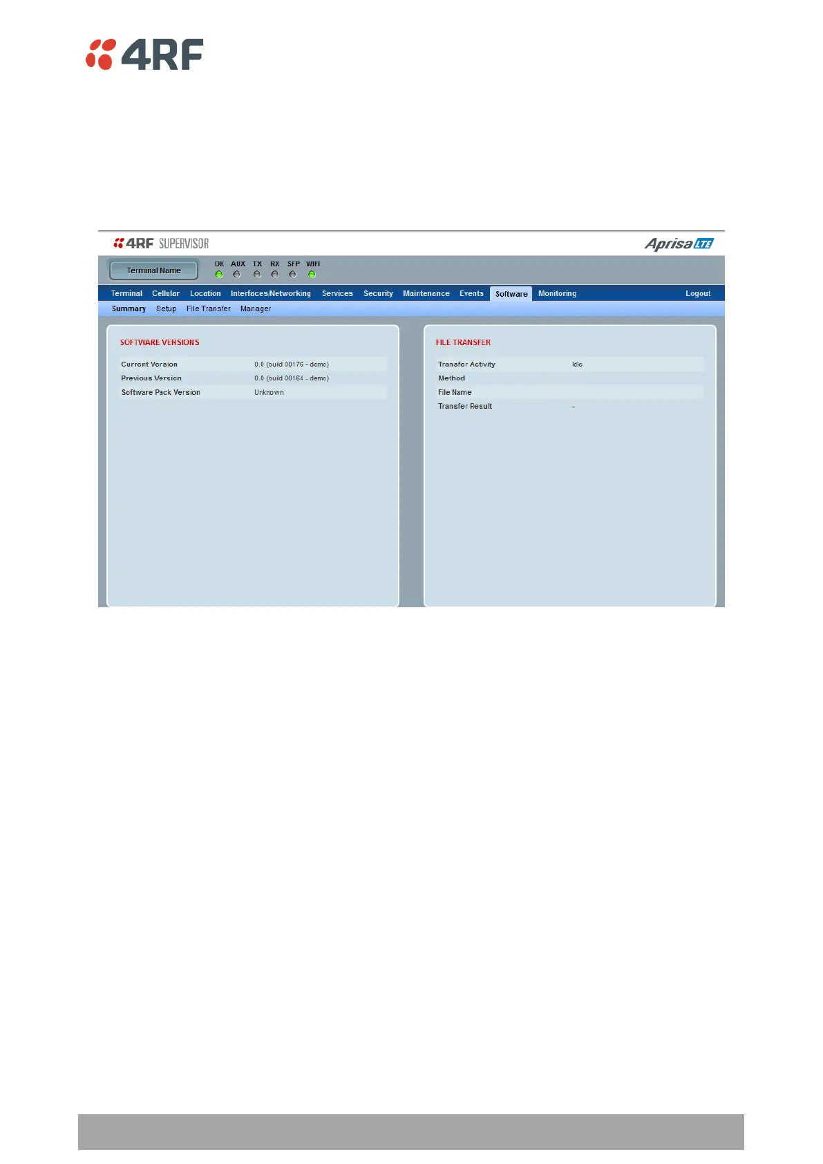 This page provides a summary of the software versions installed on the router, the setup options and the