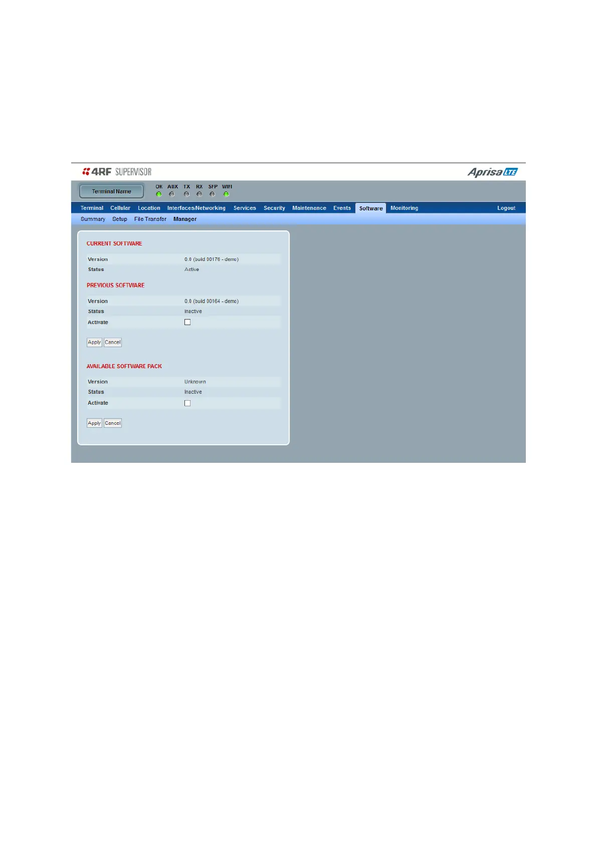 Both the previous software (if available) and Software Pack versions can be activated on the device from