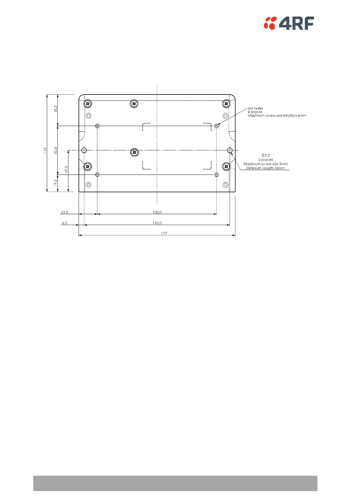 The Aprisa LTE has four threaded holes (M4) in the enclosure base and two holes (5.2 mm) through the
