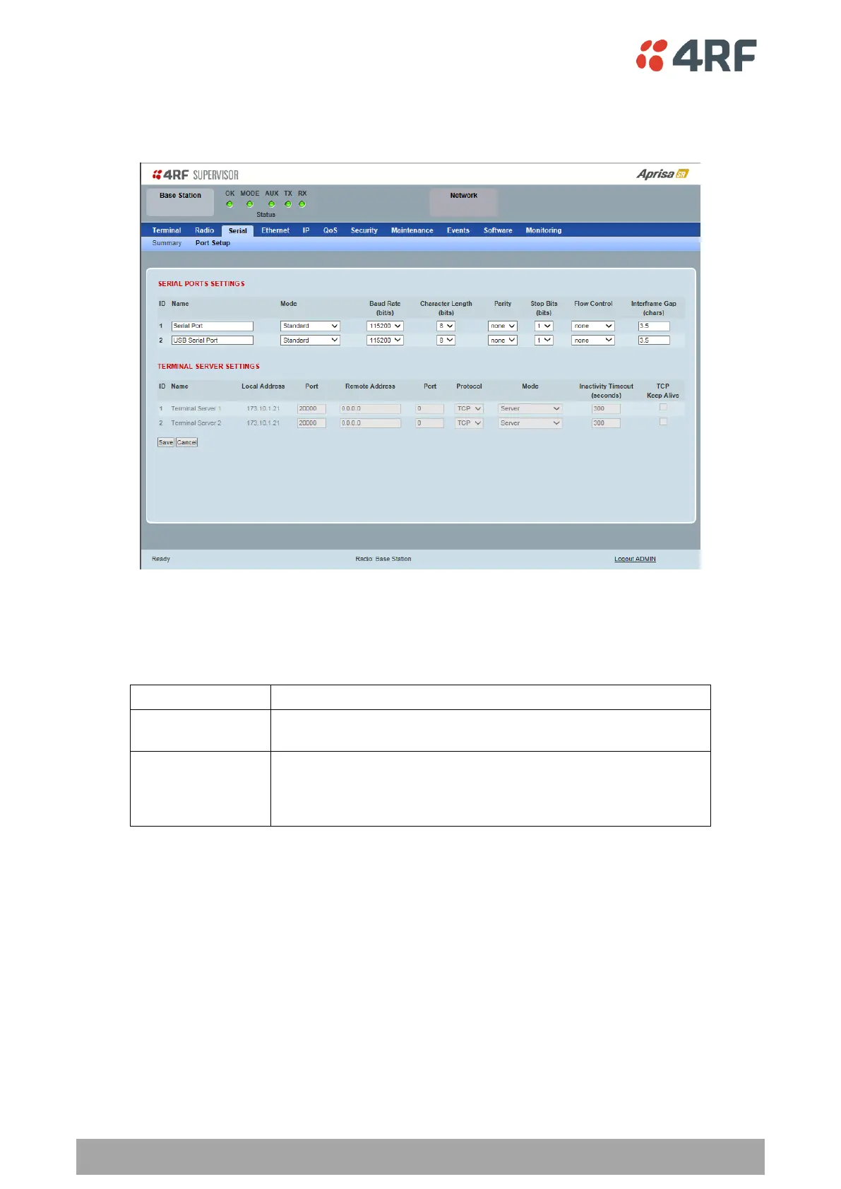 This page provides the setup for the serial port settings.
