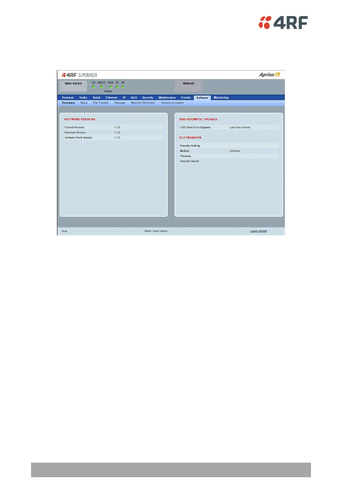This page provides a summary of the software versions installed on the radio, the setup options and the