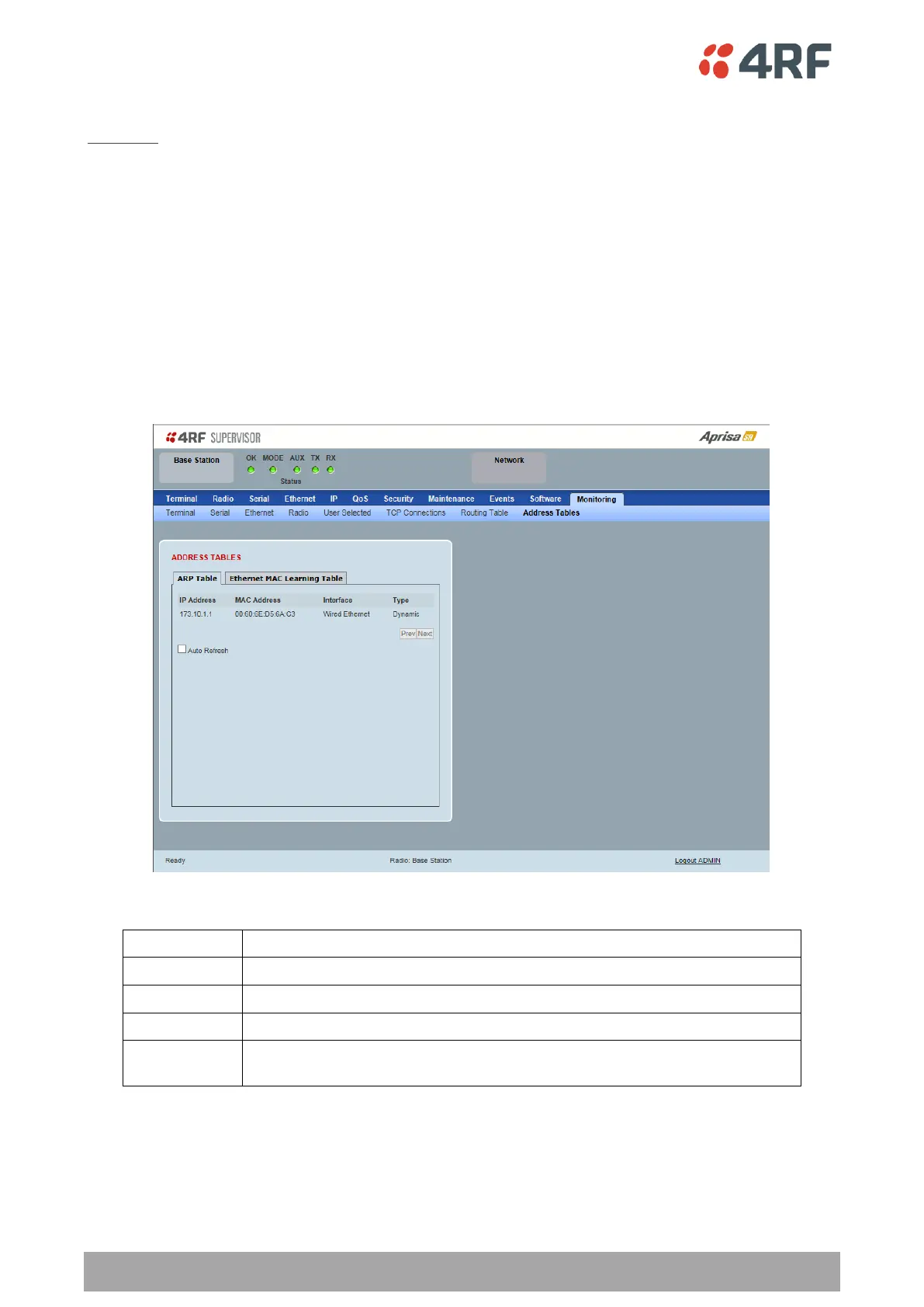 This page displays the current Address Resolution Protocols (ARP) on the radio. The radio implemented