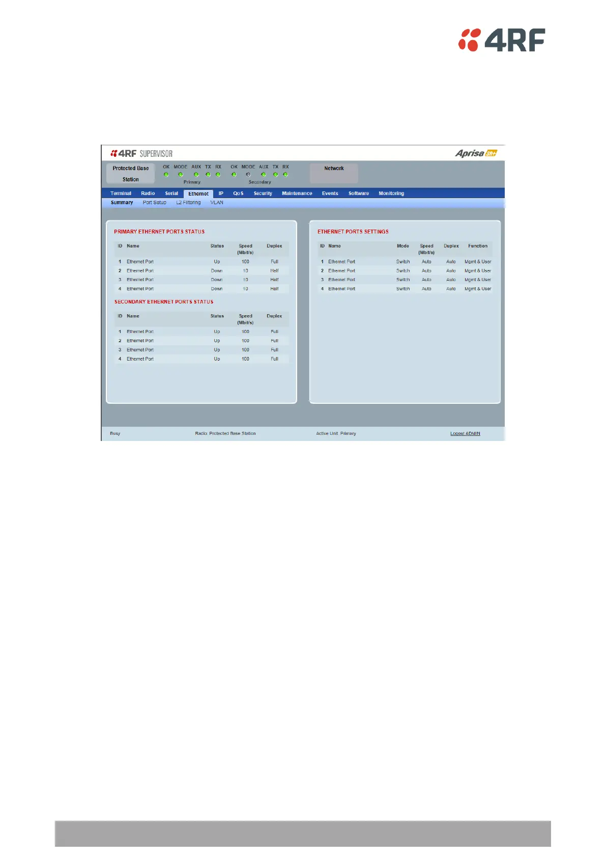 This page displays the current settings for the Protected Station Ethernet port parameters.